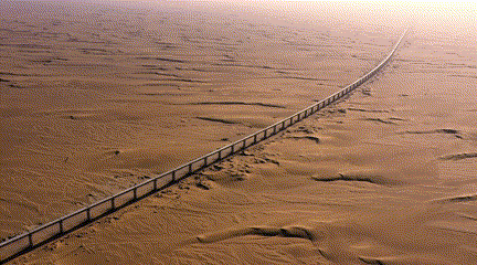 بعد كل هذه الجهود ، ظهر أمامنا أخيرًا "الممر الأخضر" الذي يبلغ طوله 300 كيلومتر تقريبًا ، ويتكون من حواجز رمال من القصب ومربعات من القصب وأشجار وشرائح شجيرات أقيمت بدورها من الخارج إلى الداخل على جانبي السكة الحديدية. . السور الأخضر العظيم ".