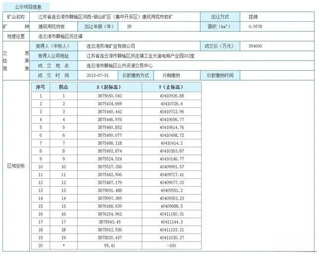 في 31 تموز / يوليه 2023 ، حقوق التعدين من الجرانيت البناء في خشى Yinshan Ganyu منطقة التعدين ، مدينة ليانيونقانغ بمقاطعة جيانغسو تم بيعها بنجاح .