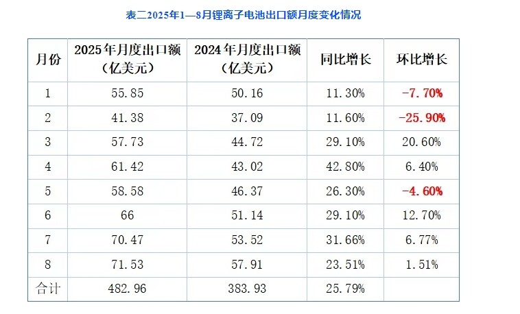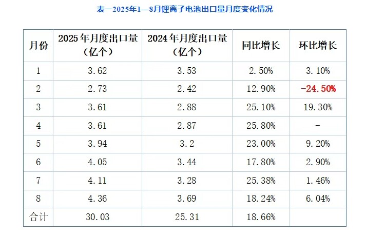 وفقا لأحدث الإحصاءات الجمركية ، في الفترة من كانون الثاني / يناير إلى آب / أغسطس 2025 ، صادرات الصين من بطاريات ليثيوم أيون استمرت في النمو المطرد ، في حجم الصادرات وحجم الصادرات قد سلمت مشرق نسخة .