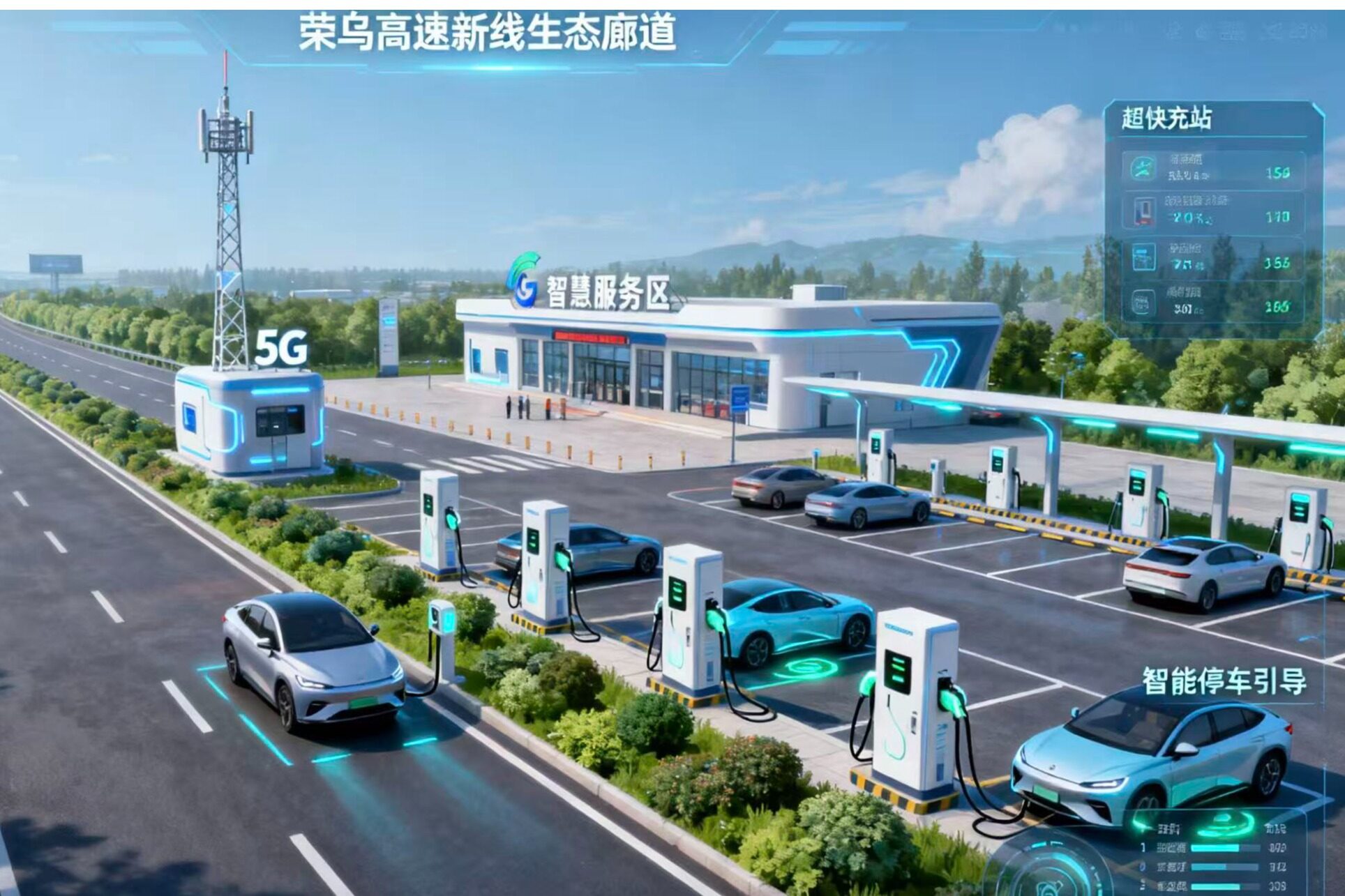 ومن الجدير بالذكر أن هذا القسم من الطريق في دعم حركة المرور الذكية سوف يتحقق أيضا عدد من " قبل التخطيط . 5G + بيدو نظام تحديد المواقع ، والتي تغطي الخط الرئيسي ، منطقة الخدمة و التبادل ، سيتم بناؤها على نطاق واسع ، والتي لا يمكن إلا أن توفر في الوقت الحقيقي معلومات ديناميكية عن حالة الطريق والحوادث تحذير المركبات المارة ، ولكن أيضا يمكن أن تساعد الإدارة على تحقيق دقة الإشراف على مركبات الشحن ، على نحو فعال في منع النقل غير المشروع مثل الزائد . منطقة الخدمة سيتم ترقية وفقا لمعيار " ذكي بعد " ، وإدخال ذكي وقوف السيارات دليل ، لا معنى له دفع الغاز ، الطاقة الجديدة المركبات فائقة السرعة محطة شحن وغيرها من المرافق ، كل منطقة الخدمة التخطيط والبناء من 20 فائقة السرعة شحن أكوام ، يمكن تحقيق " 15 دقيقة من الشحن 200 كيلومتر ، لتلبية احتياجات الطاقة الجديدة أصحاب السفر لمسافات طويلة .