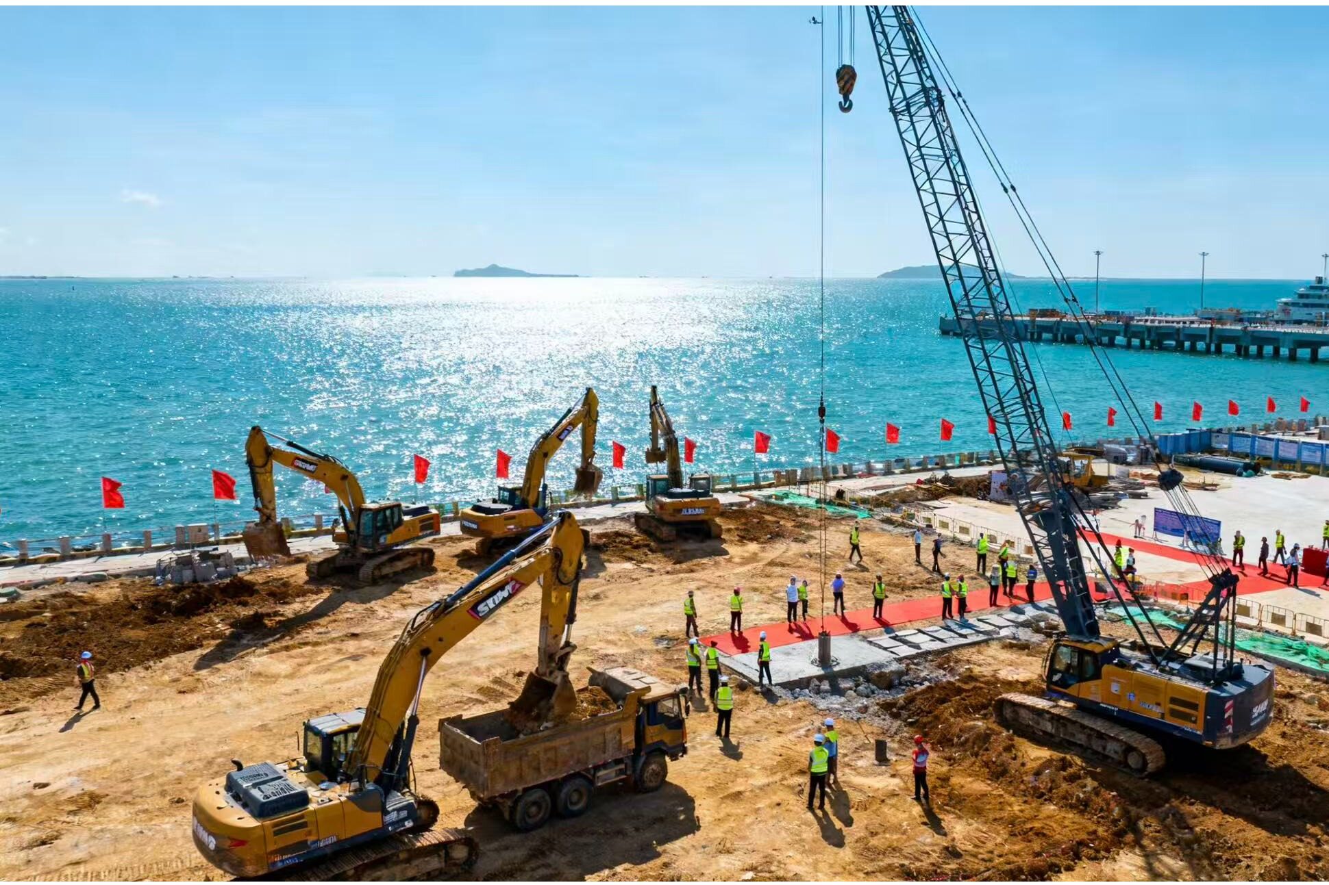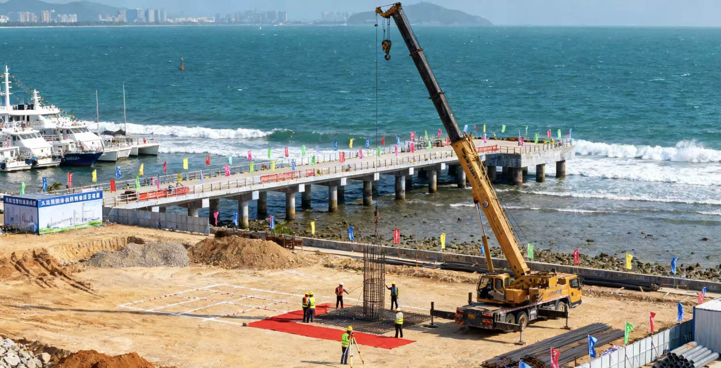 في عملية البناء ، وحدات البناء سوف تتبع بدقة مبدأ " السلامة أولا ، نوعية المنحى ، البناء الأخضر " ، وفقا للظروف الجيولوجية الخاصة في المنطقة الساحلية ، واعتماد متقدمة كومة الأساس تكنولوجيا البناء ، ومكافحة التآكل التكنولوجيا وحماية البيئة المادية ، والحد الأقصى من تأثير على البيئة الايكولوجية البحرية المحيطة بها . في الوقت الحاضر ، فريق البناء قد دخلت بالفعل في مرحلة مبكرة من العمل ، بما في ذلك تسوية الموقع ، وبناء مرافق مؤقتة ، وما إلى ذلك ، وبعد ذلك ، سيتم تعزيز بناء الهيكل الرئيسي ، وتركيب الكهربائية والميكانيكية ، الديكور ، وما إلى ذلك وفقا للخطة ، ومن المتوقع أن يكون مجموع فترة البناء 24 شهرا
