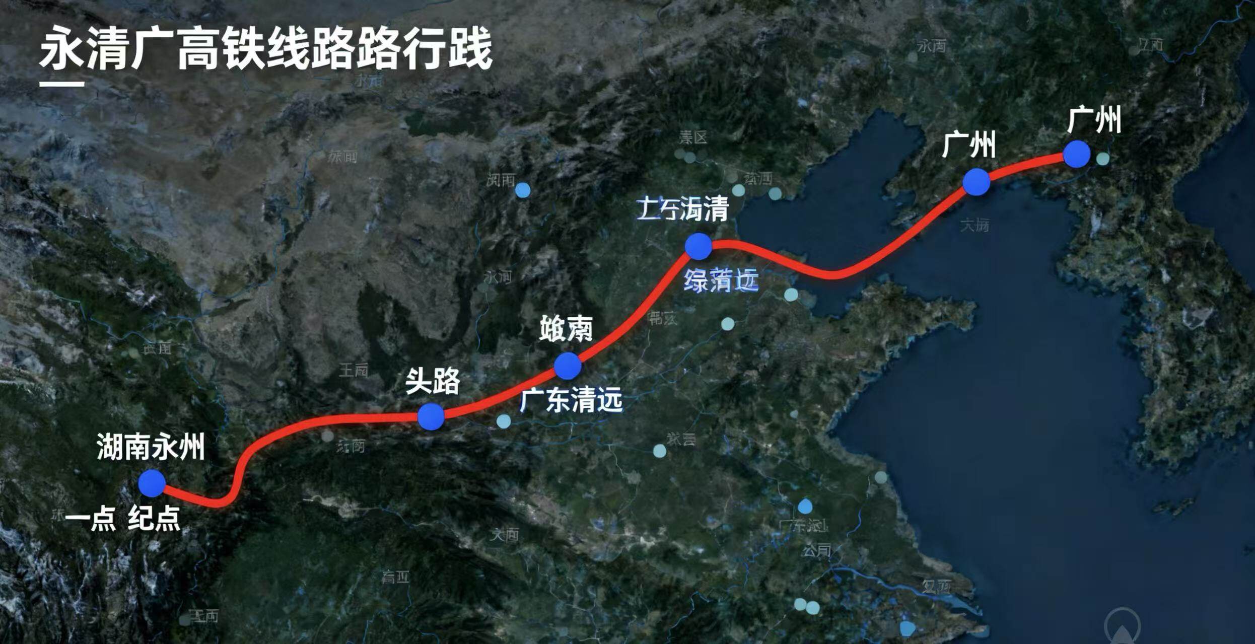يونغ تشينغ قوانغتشو السكك الحديدية عالية السرعة خط رئيسي بطول حوالي 390 كيلومترا ، تصميم سرعة 350 كيلومترا في الساعة ، ويقدر مجموع الاستثمار أكثر من 95 مليار يوان . خط من مدينة يونغتشو بمقاطعة هونان ، من خلال مدينة يونغتشو lingling منطقة Lengshuitan , مقاطعة دونغ ، مدينة تشينغيوان بمقاطعة قوانغدونغ Lianzhou ، يانغشان مقاطعة ، مقاطعة تشينغتشنغ تشينغشين ، وأخيرا إلى منطقة هوادو ، وقوانغتشو ، خط كامل من 14 محطة ، بما في ذلك 9 محطات جديدة ، وربط القائمة 5 محطات . ومن الجدير بالذكر أن المشروع يمر عبر المنطقة الأساسية من جبال Nanling ، الظروف الجيولوجية المعقدة ، جسر ونفق نسبة تصل إلى 84.24 في المائة ، وسوف بناء العديد من الأنفاق والجسور طويلة جدا ، العديد من المؤشرات الهندسية والتقنية لتحقيق المستوى المتقدم من بناء السكك الحديدية عالية السرعة في الصين