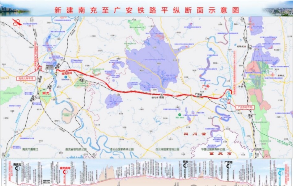 نشر وثائق تحدد تفاصيل المشروع خطة البناء . الطريق يبدأ في شمال محطة سكة حديد نانتشونغ ، ويمر من خلال shunqing Gaoping , حي , مدينة قوانغان Yuechi مقاطعة Guang ' an , حي Huaying المدينة . خط كامل طول 94.807 كم ، من بينها 85.289 كم بنيت حديثا على الخط الرئيسي ، واستخدام جزء من القائمة و تحت الإنشاء بمهارة موارد السكك الحديدية ، مما يعكس كفاءة البناء المكثف الفكرة .