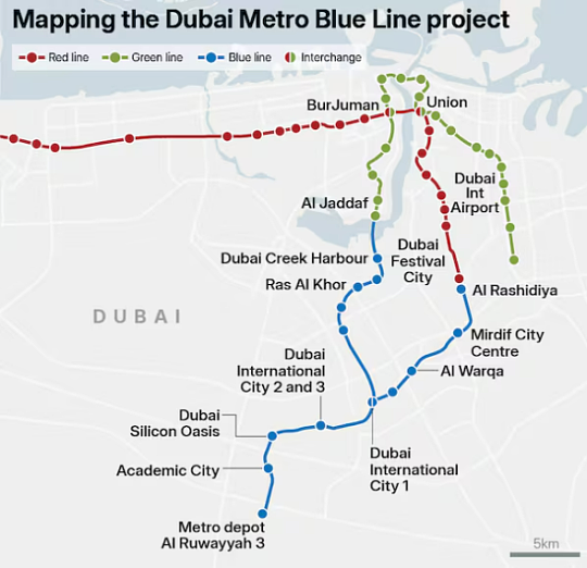 مترو دبي الخط الأزرق المشروع منذ حزيران / يونيه 2025 ، كسر الأرض ، فقط خمسة أشهر لإكمال 10 ٪ من الجدول الزمني للبناء ، فإن معدل الإنجاز العام قد بلغ 12 في المائة . ويشرف على هذا المشروع التاريخي فريق مؤلف من 500 مهندس وخبير أنجز أكثر من 4.6 مليون ساعة عمل في كل موقع من مواقع البناء .