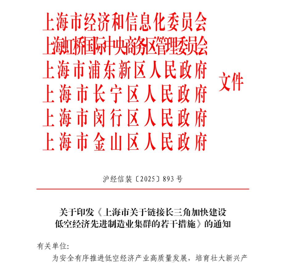 هذه السياسة الجديدة تحدد الهدف العام المتمثل في التنمية الاقتصادية على علو منخفض في شنغهاي : بحلول عام 2028 ، سلسلة صناعية كاملة من الطائرات الجديدة على علو منخفض سيتم تشكيل نظام التصنيع المتقدمة مجموعات من البلدان ذات الاقتصاد المنخفض سيتم بناؤها . هذه الورقة تقدم 16 تدابير ملموسة في أربعة اتجاهات رئيسية ، بما في ذلك تمويل البحث والتطوير والتصنيع ، وبناء البيئة الصناعية ، والتنمية المنسقة في دلتا نهر اليانغتسى .