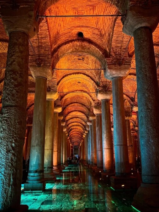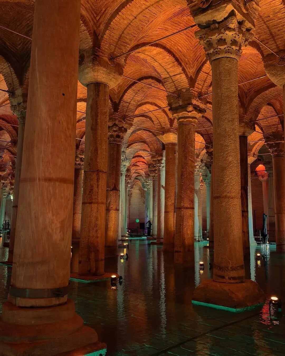 في الغرفة المظلمة المدعومة بـ 36 عمودًا حجريًا، يعكس سطح الماء الأعمدة الحجرية، وكأنك دخلت إلى "أليس في بلاد العجائب".
