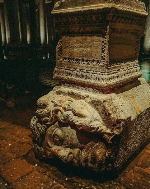 عمدان ضخمتان تضغطان على رأس مدوسا، وفقًا للأساطير، بعد أن قام القديس بقطع رأسها، استُخدم الرأس لضغط المياه الجوفية.
