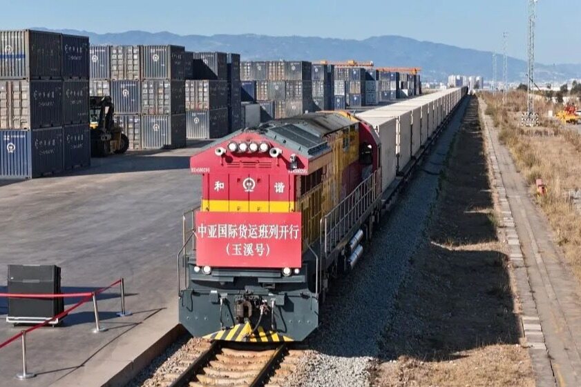 أول قطار الشحن الدولي في آسيا الوسطى تسير جنوبا على طول السكك الحديدية المتعرجة . على طول السكك الحديدية ، الخضروات الطازجة يوننان سوف تظهر في السوق التايلاندية في وقت لاحق ، الصلب الصينية سوف تستخدم في مشاريع البناء في جنوب شرق آسيا .