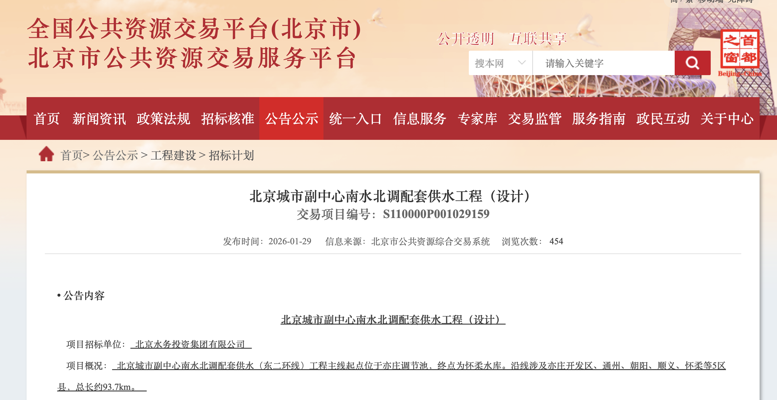 التحقيق في أعمال تصميم إمدادات المياه من الجنوب إلى الشمال مشروع نقل المياه في بكين نائب مركز المدينة بدأت المناقصة . مجموع طول 93.7 كم ، استثمار ما مجموعه 14.375 مليار يوان من شريان الحياة تحت الأرض من التخطيط الأولي لتنفيذ الهبوط خطوة رئيسية . تدفق المياه لم تتحرك ، والمسح في وقت مبكر ، هذه المعركة بشأن أمن إمدادات المياه في المناطق الحضرية في بكين ، وحتى في جميع أنحاء شمال بكين ، بدأت بالفعل .