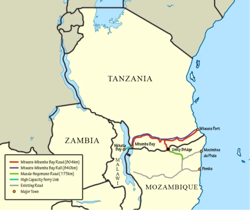 مشروع السكك الحديدية القياسية في خليج متوارا مبامبا تمتد في جنوب تنزانيا من ميناء متولا في المحيط الهندي إلى الشرق من خليج مبامبامبا في بحيرة نياسا إلى الغرب ، ويبلغ طولها حوالي 1000 كيلومتر ، ويخطط لبناء خطوط فرعية إلى ريغانغا و متشوما . تصميم السكك الحديدية لنقل الركاب بسرعة 160 كيلومترا في الساعة ، سرعة الشحن 120 كيلومترا في الساعة ، في المستقبل سوف تمتد إلى موزامبيق وملاوي وغيرها من البلدان غير الساحلية ، أصبحت منطقة شرق أفريقيا اللوجستية الهامة في الممر .