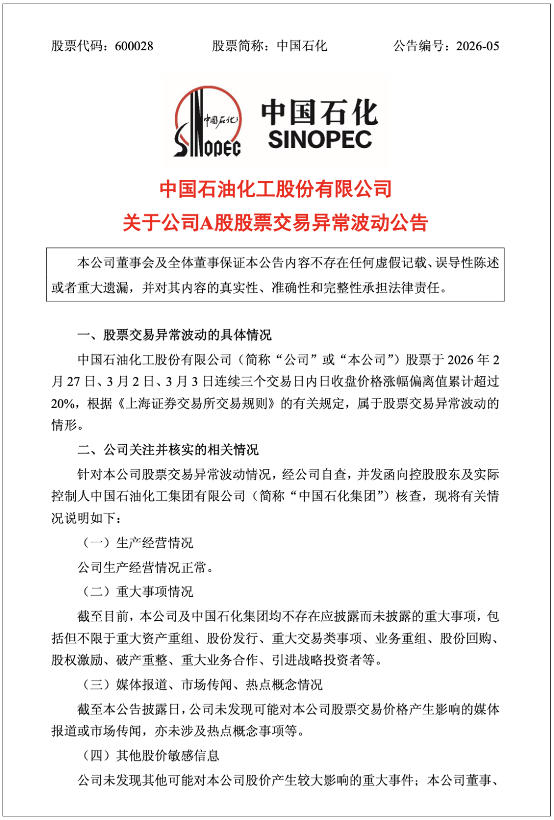 سينوبك أعلن أن أسهم الشركة في 27 شباط / فبراير ، 2 آذار / مارس ، 3 آذار / مارس 2026 ، في غضون ثلاثة أيام تداول متتالية من سعر الاغلاق زيادة الانحراف التراكمي أكثر من 20 ٪ ، وفقا " بورصة شنغهاي قواعد التداول " الأحكام ذات الصلة ، تداول الأسهم تقلبات غير طبيعية .