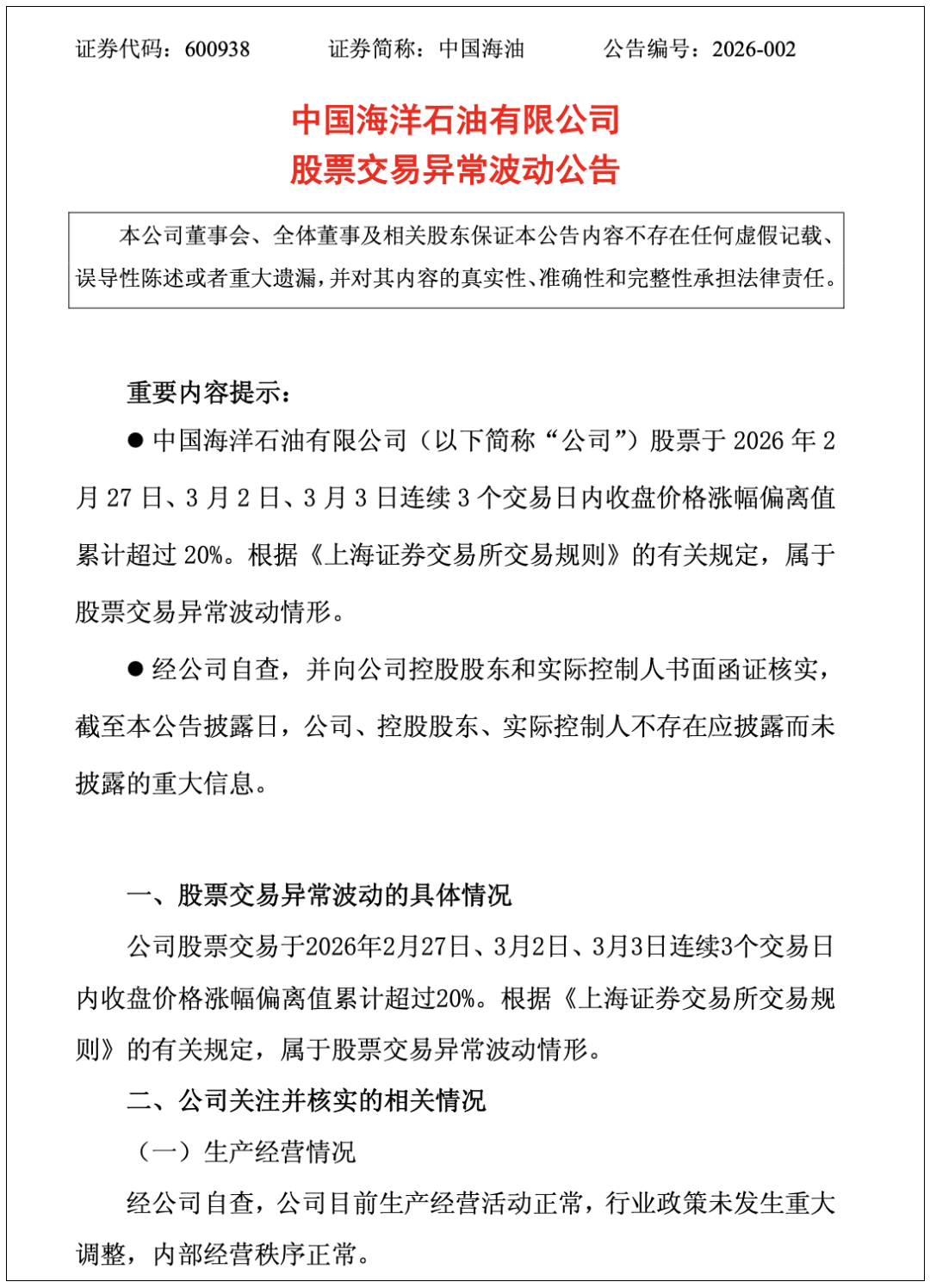 الصين الوطنية للنفط البحرى أعلن أن تداول الأسهم في 27 شباط / فبراير ، 2 آذار / مارس ، 3 آذار / مارس 2026 في ثلاثة أيام تداول متتالية من ارتفاع أسعار الإغلاق أكثر من 20 ٪ من قيمة الانحراف التراكمي . وفقا للأحكام ذات الصلة من قواعد التداول في بورصة شنغهاي ، فإنه ينتمي إلى تقلبات غير طبيعية في تداول الأسهم .