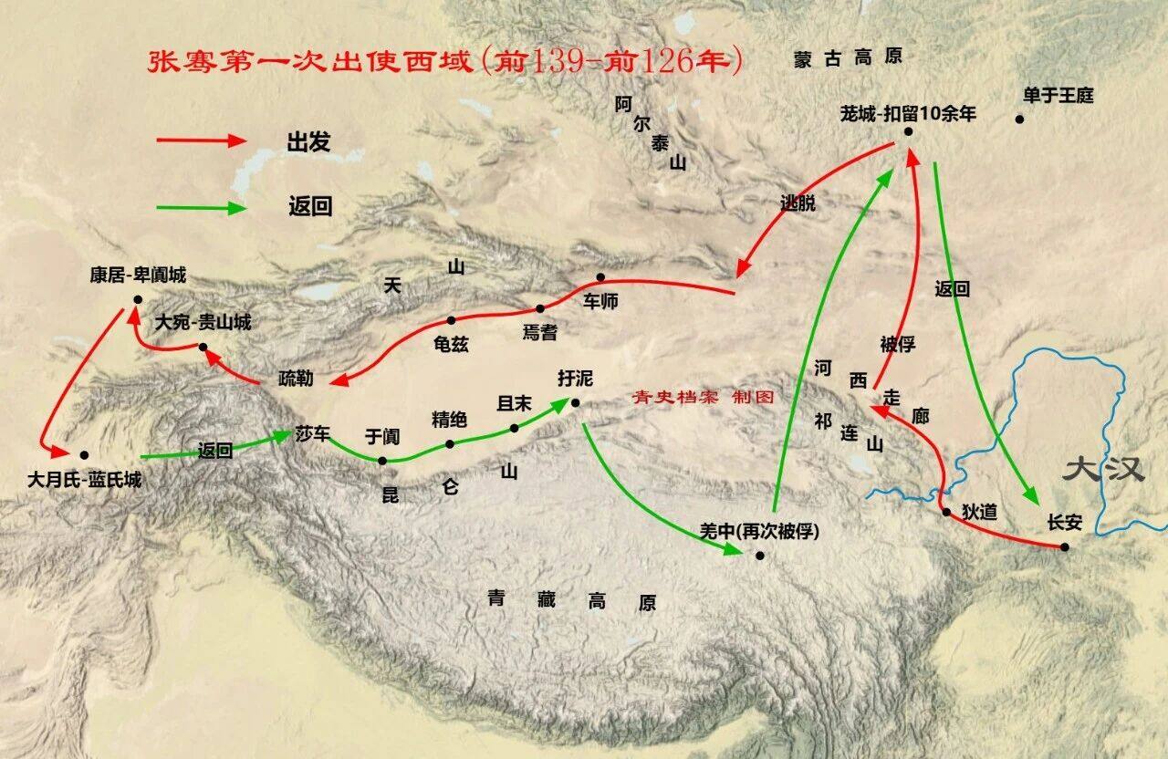الامبراطور هان وو جيان يوان سنتين ( 139 سنة مضت ) ، تشانغ تشيان تجنيد من تشانغآن ( الآن شمال غرب شيان ، وشنشى ) بعد 13 عاما من الصعوبات والمخاطر ، وأخيرا الانتهاء من " قطع " رحلة . ويمكن تقسيم الرحلة إلى ثلاث مراحل :