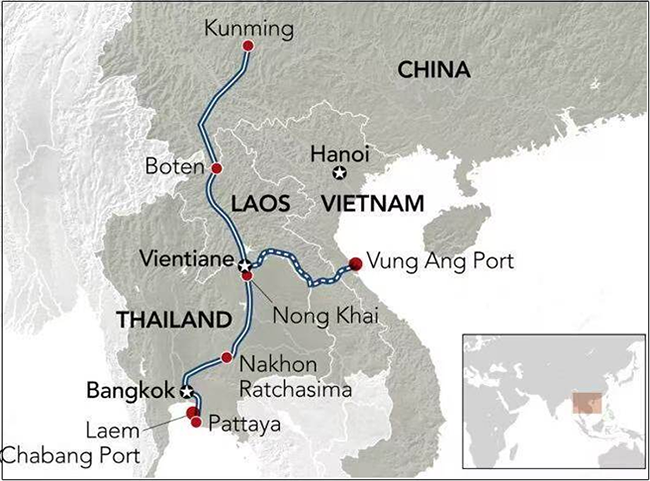 مجموع طول السكك الحديدية حوالي 562 كيلومترا ، بدءا من فينتيان عاصمة لاوس ، في نهاية المطاف إلى فيتنام مقاطعة خه جينغ يون قان الميناء ، بلد غير ساحلي لاوس من خلال الوصول المباشر إلى ميناء السكك الحديدية والخدمات اللوجستية . خط السكك الحديدية الصينية القديمة مع نفس معيار قياس السرعة القصوى لنقل الركاب 150 كيلومترا في الساعة ، أقصى سرعة الشحن 80 كيلومترا في الساعة ، استثمار ما مجموعه حوالي 6.6 بليون دولار من دولارات الولايات المتحدة .
