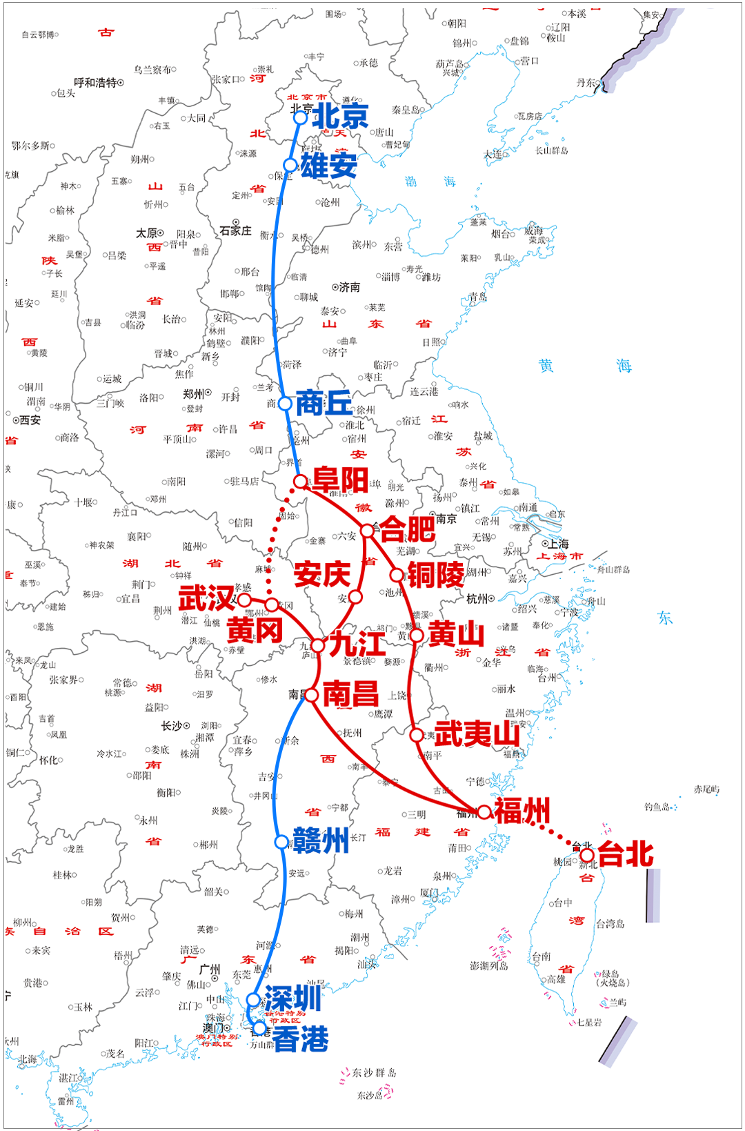 في تخطيط شبكة السكك الحديدية عالية السرعة ، بكين وهونغ كونغ السكك الحديدية عالية السرعة هو مفتاح الشمال والجنوب على الجانب الشرقي من بكين وقوانغتشو الطريق . هذا الخط من بكين ، بعد xiongan شانغكيو ، فويانغ ، جنوب تشكيل العديد من الاتجاهات : طريق الشرق يمر خفى تشينغ جيوجيانغ نانتشانغ Ganzhou شنتشن وهونغ كونغ ، خفى ، تونغلينغ ، هوانغشان ، وفوتشو Wuyishan تم من خلال التخطيط يمكن أن تمتد عبر مضيق تايوان إلى تايبيه . غرب الطريق من فويانغ اكسينيانج هوانغقانغ جيوجيانغ نانتشانغ Ganzhou شنتشن وهونغ كونغ ، فويانغ هوانغقانغ الباب يمكن أن يتحقق بعد الانتهاء .