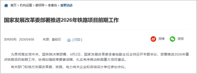 في 2 نيسان / أبريل 2026 ، لى تشون لين ، نائب مدير اللجنة الوطنية للتنمية والاصلاح ، ترأس اجتماع خاص لدراسة نشر العمل الأولي من مشاريع السكك الحديدية الرئيسية في عام 2026 ، وتنسيق تنفيذ السياسات والعناصر الرئيسية لضمان التقدم المطرد في بناء مشاريع السكك الحديدية الرئيسية . بعد 10 مشاريع السكك الحديدية الرئيسية ، ومن المتوقع أن تبدأ رسميا في عام 2026 .