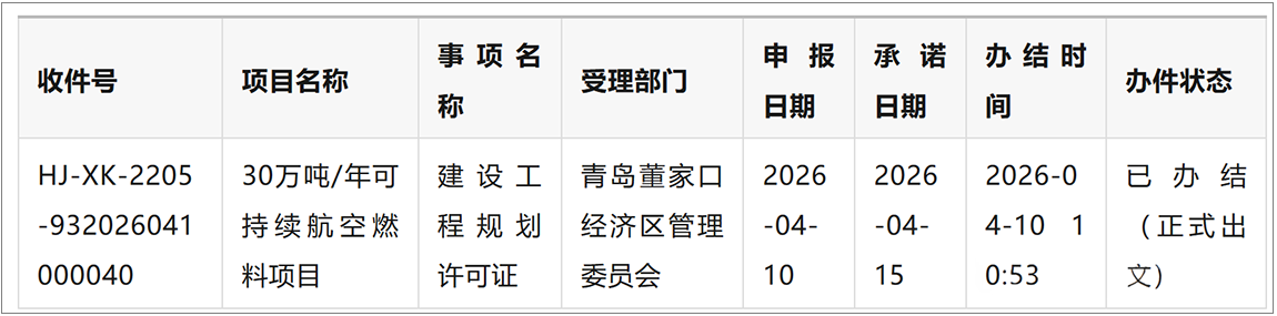 في 10 نيسان / أبريل 2026 ، وتشينغداو dongjiakou 300 ألف طن / سنة من وقود الطيران المستدام المشروع بنجاح الحصول على رخصة البناء والتخطيط ، مما يعني أن المشروع الرئيسي للطاقة الخضراء منخفضة الكربون على وشك البدء في البناء الفعلي . استثمرت تشينغداو Shangyu حماية البيئة المحدودة ، مع استثمار ما مجموعه 26.463 مليار يوان ، ويقع المشروع في dongjiakou الكيميائية الصناعية بارك ، وتشينغداو .