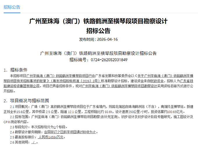 وبحسب إعلان المناقصة ، مقاطعة قوانغدونغ للتنمية والاصلاح اللجنة قد وافقت على تنفيذ أعمال المسح والتصميم من خلال الرد على المسائل ذات الصلة بشأن المناقصات من قوانغتشو وتشوهاى ( ماكاو ) السكك الحديدية Hezhou Hengqin القسم ( رقم 3 [ 2026 ] من قوانغدونغ للتنمية والاصلاح دعوة العطاءات والموافقة عليها ) ، مشروع البناء الممولة من الأموال المالية ، وقوانغدونغ بناء السكك الحديدية مجموعة الاستثمار المحدودة هي المسؤولة عن أعمال المناقصة .
