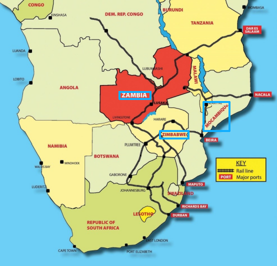 رؤية أكبر هو أن السكك الحديدية سوف تعمل في عمق شبكة الطرق القائمة في زمبابوي ، من خلال هراري إلى موزامبيق من خلال ميناء مارشيباندا ، في نهاية المطاف إلى ميناء بيلا ، ما مجموعه حوالي 762 كيلومترا من ممر لوجستي كبير . . . . . . . وتحقيقا لهذه الغاية ، يجب تحديث 445 كيلومترا من الطرق الموجودة في زمبابوي في وقت واحد للقضاء على نقاط العبور .