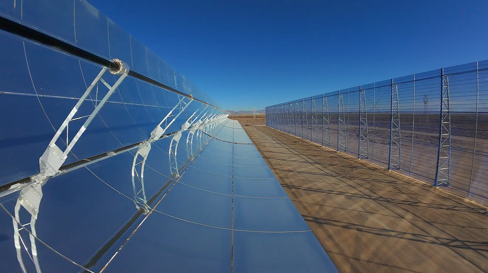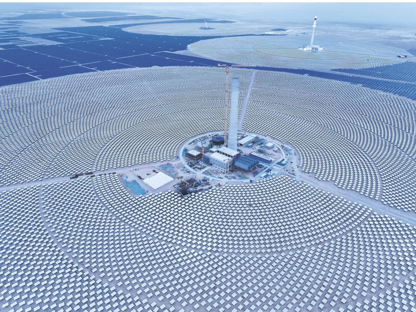 في صحراء غوبي في مدينة Delingha ، مقاطعة تشينغهاى ، مجموعة من " سوبر ميرور " صفائف مع ما يقرب من 6000 متر مربع من المساحة الإجمالية هي التألق في الشمس الحارقة من الهضبة .